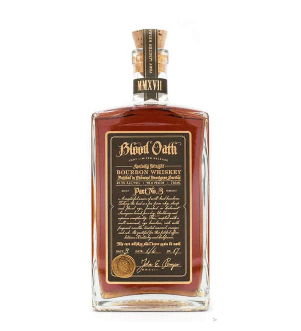 WArguably Blood Oath's most sophisticated and complex release, the Pact No. 3 is a luxurious blend of a 12-year traditional bourbon, another bourbon aged for 7 years, and finally, a 7-year-old bourbon finished in Cabernet Sauvignon casks from Swanson Vineyards. In keeping with Blood Oath's tendency to allow the most unique element to dominate or command the palate, Pact No 3 emerges as a smooth, silky, and superbly wine-influenced spirit that showcases an immaculate balance between the refined, nuanced bourbons and the red-wine cask finished blend.